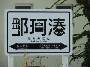 駅名看板に猫のイラストが