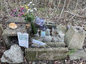 東久留米の中央を流れる落合川は清流である。南沢湧水群が支流にある。ここは東京のオアシス、豊富な水が溢れ出す。住宅街を巡っていく。川藻が流れに漂い、様々な魚と野鳥が集まって来る。人も安らぎを求め集まって来る。のんびりした風情が人を引き付けて止まない。今回コゲラは写真に撮れなかったが、カワセミが撮れた。大きな収穫である。野鳥も安心して人と共存しているようである。ここで初めてカワセミのお墓を見た。落合川は住民にとってオアシスとなっていることが分かる。